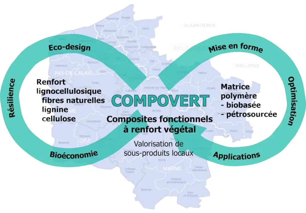 Le projet COMPOVERT a pour objectif le développement transfrontalier de matériaux composites fonctionnels à renfort végétal, notamment via la valorisation de (sous-)produits locaux tels que les fibres lignocellulosiques ou la lignine.