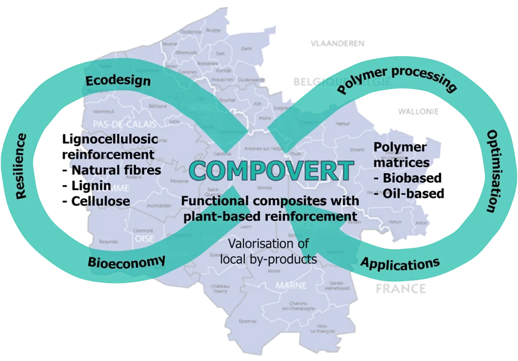 The COMPOVERT project aims at fostering cross-border collaborations to develop new functionalised composite materials reinforced with plant-based fibres or particles, via the valorisation of local (by)-products such as lignocellulosic fibres or lignin.